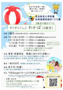 奈良教育大学附属幼保連携型認定こども園(以下、奈良教育大学附属こども園)では、下記日程に2歳齢のお子様と保護者様を対象とした親子クラス「すくすくくらぶ わかば」を実施します。