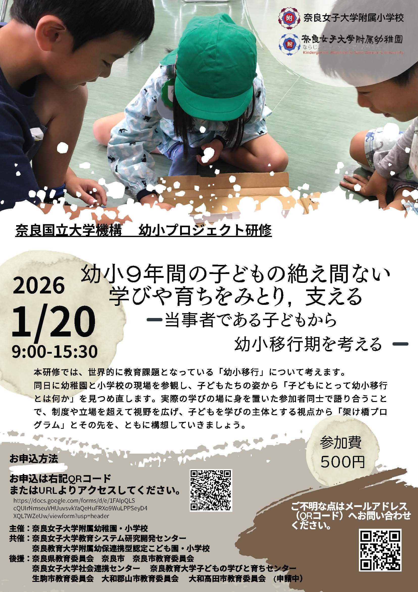 奈良国立大学機構において、幼小9年間の子どもの絶え間ない学びや育ちをみとり, 支えるをテーマに研修会を実施いたします。